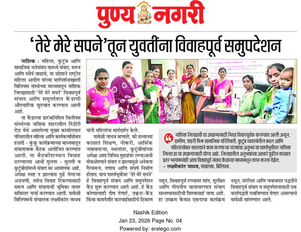 राष्ट्रीय महिला आयोग (NCW) यांच्या मार्गदर्शनाखाली बिलीफ्स संस्था (BELIEFS) यांच्या माध्यमातून नाशिक येथे ‘तेरे मेरे सपने’ विवाहपूर्व संवाद आणि समुपदेशन केंद्र (PMCC) सुरू करण्यात आले.